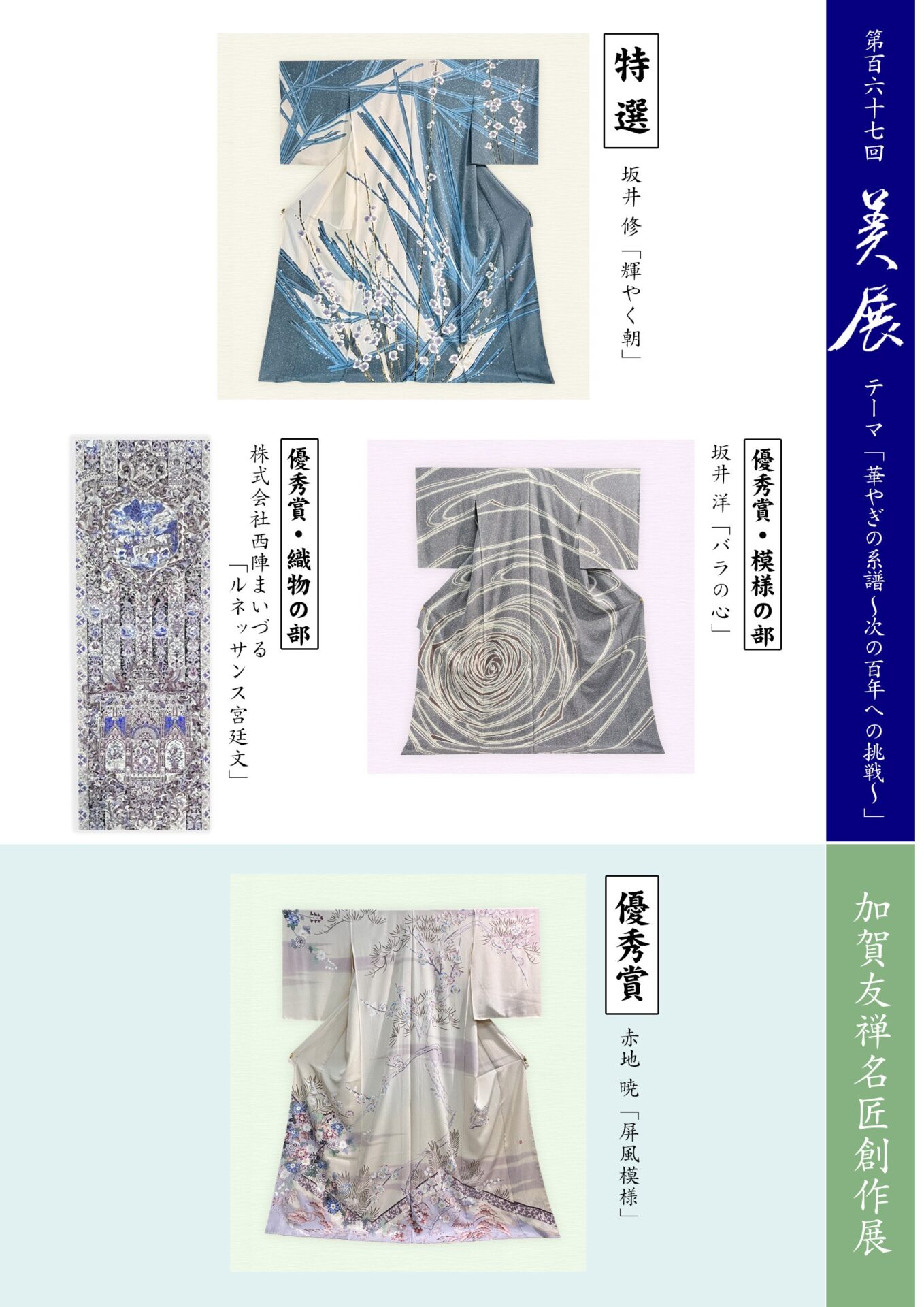 このたびの加賀友禅名匠創作展は、令和7年11月4日に京都市立芸術大学 吉田雅子先生をお招きし、厳正なる審査の結果、下記の通り、特選を決定いたしましたので、ご通知申し上げます。